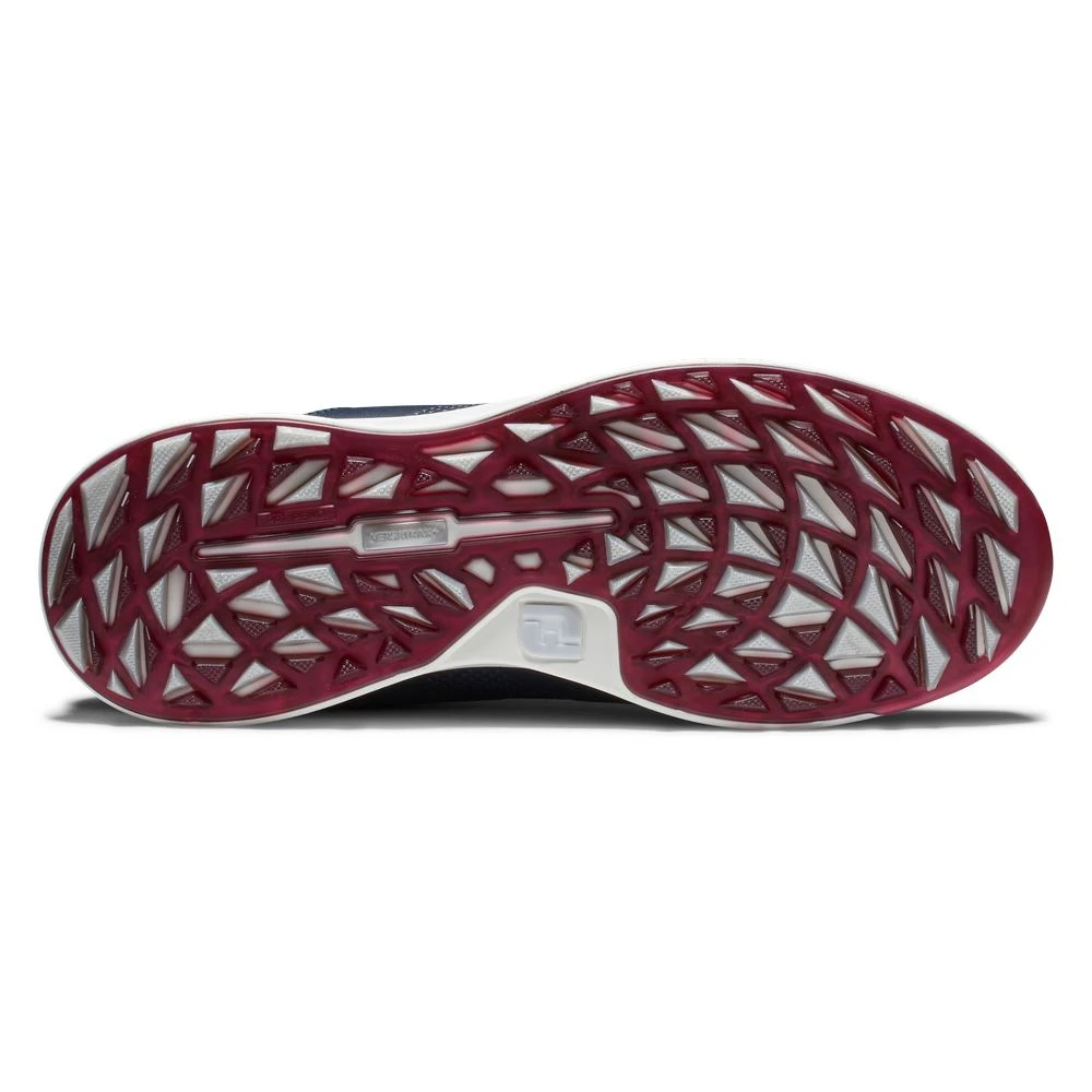 The FJ Ladies Stratos Golf Shoe gives cloud-like comfort and can be worn on and off the golf course. Featuring a proprietary cushioning system engineered from a unique compound blend that allows each shoe to absorb shock and return energy. The massive benefit of this energy return is that each shoe works for you, helping reduce foot fatigue in improving performance. Asymmetrical HeelLoc2 offers increased rear-foot support in an athletic-inspired style. The StratoFoam midsole and Cork Covered PU FitBed work together to create a plush and comfortable ride. The translucent rubber traction pieces increase traction with each stride while providing a high-end look and feel—a unique anti-channeling traction pattern designed for grip from any lie or angle. Toes can spread out and grip thanks to the fully rounded toe character and a full fit across the forefoot.