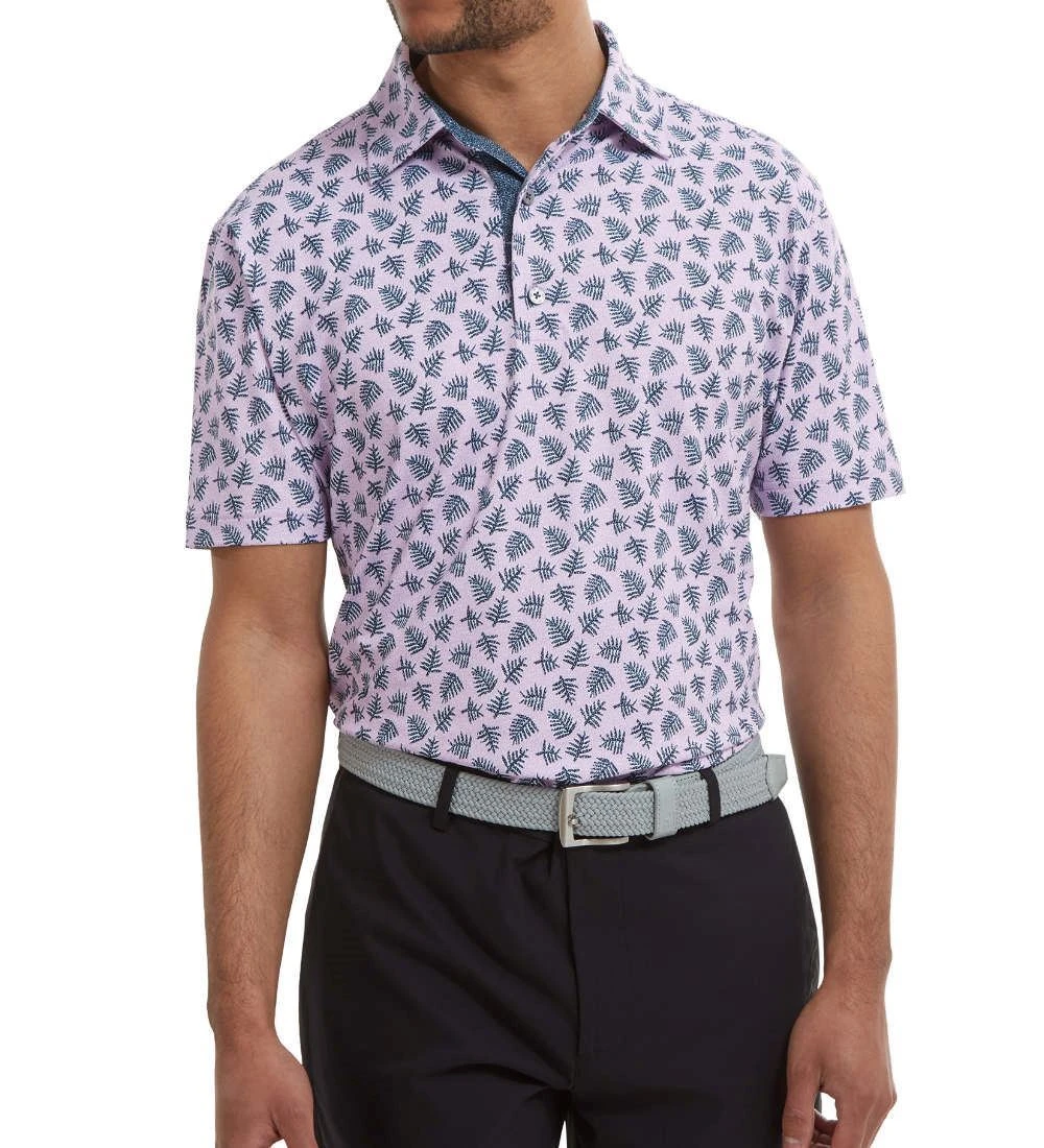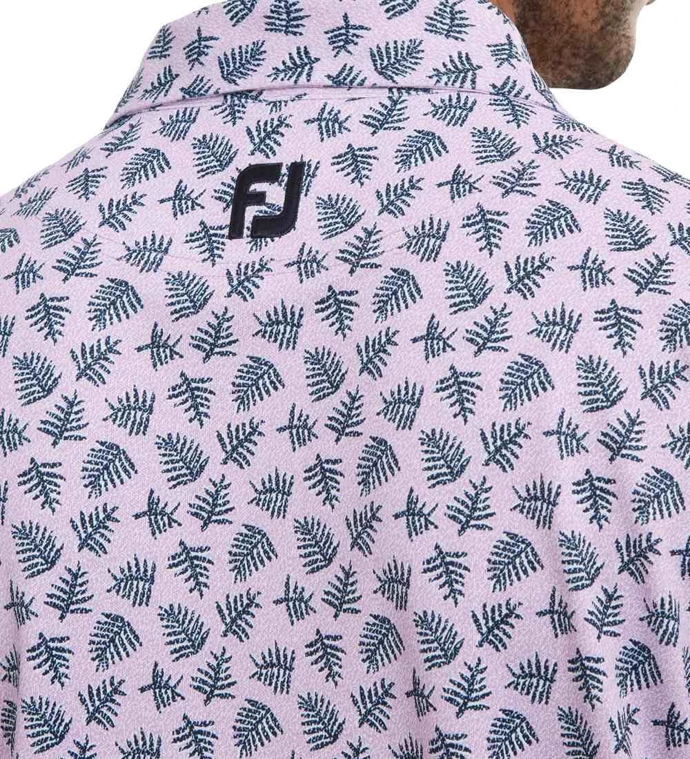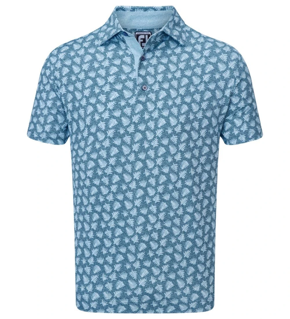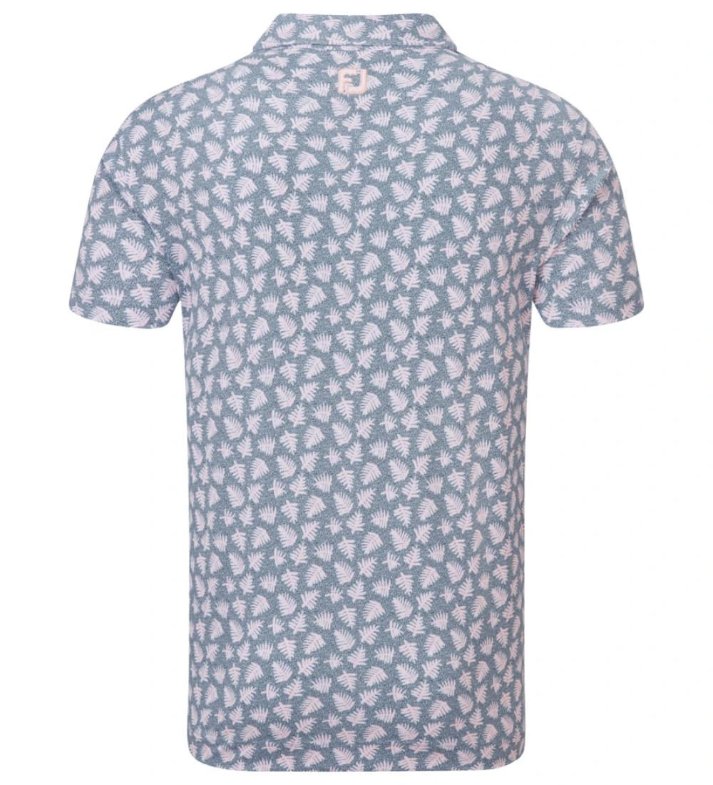 FJ ProDry Stretch Pique fabric. All over palm leaf shadowed print pattern. Colour co-ordinate rear yoke FJ logo and collar stand. Moisture wicking technology draws moisture away from the body. Easy care fabric to minimise wrinkling. SPF 30 UV protection